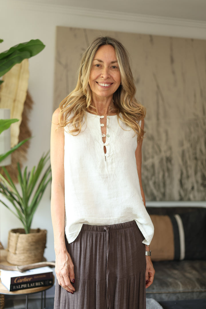 Delicada y femenina ésta blusa 100% lino . Muy linda la parte de los botones que puedes usar cerrados o abiertos . Botones anacarados . Color mantequilla . Talla única .