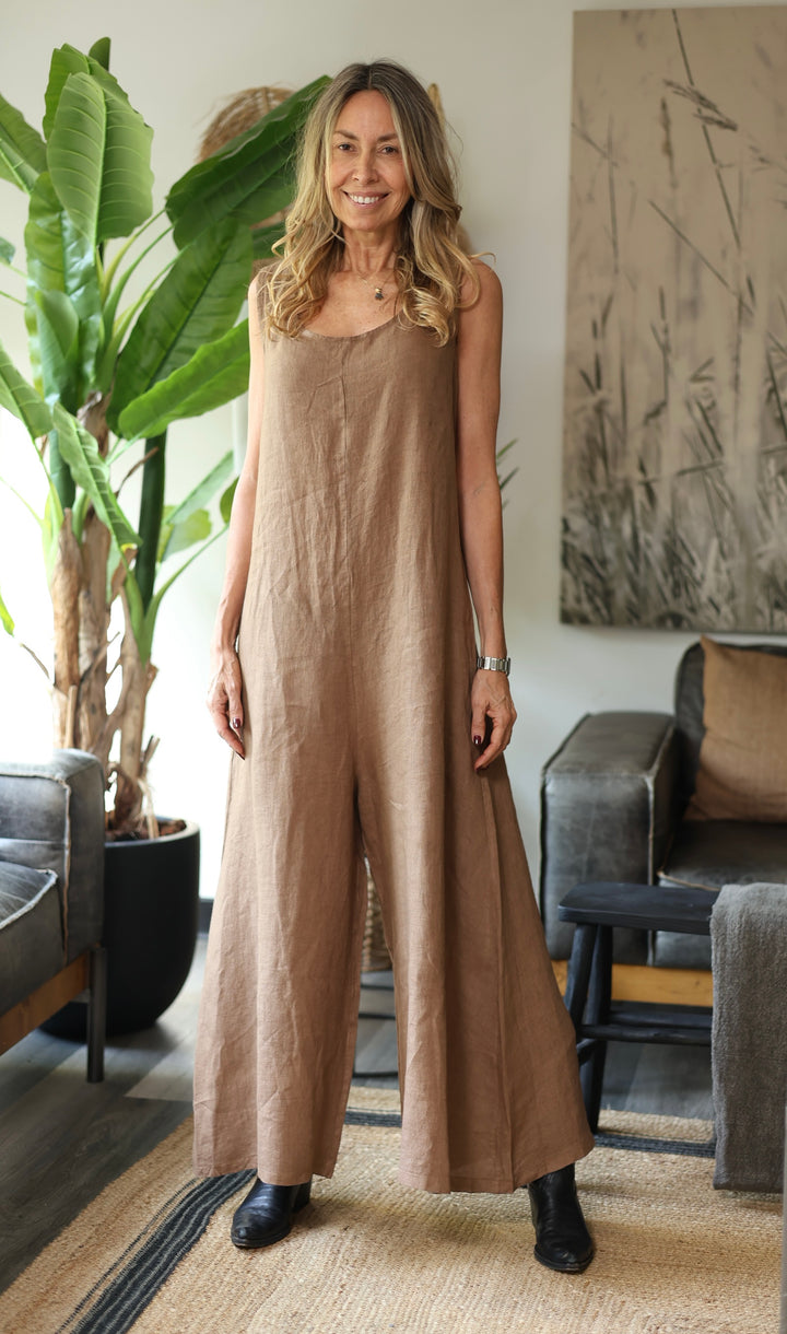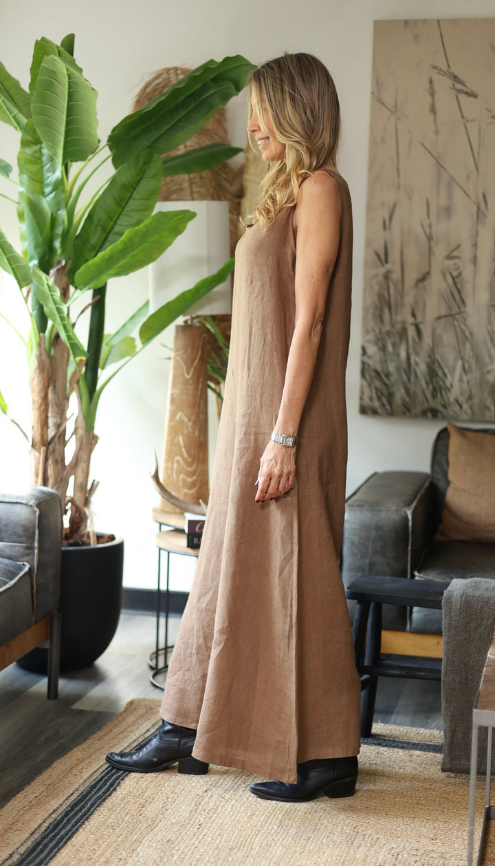 Solo de imaginárselo lo liviano y fresquito . Es una talla única universal que se adapta mejor a una talla ML . Color Camel Coffee . 100% lino .
