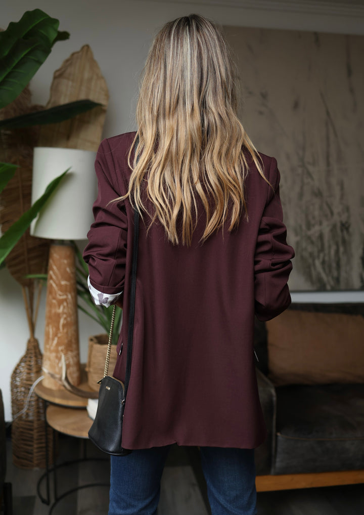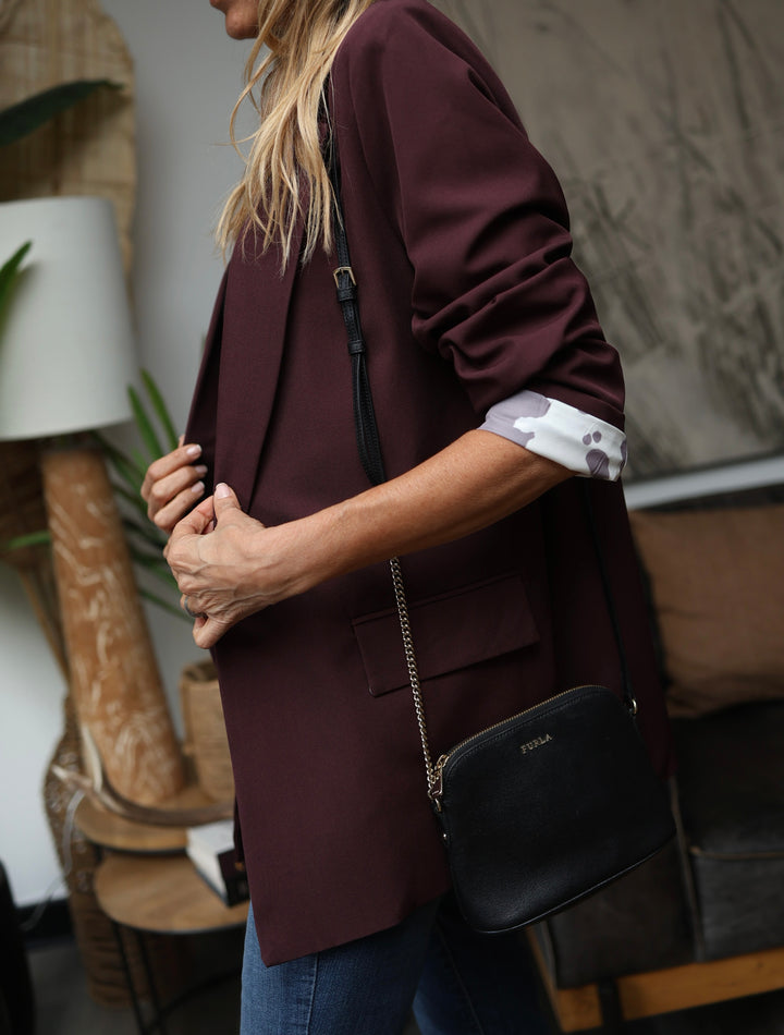 Blazer viscosa opaco . Forro satinado color ciruela oscuro . Lleva forro a satinado print en mangas por todo su interior ( blanco y burdeo ) y en solapa interior bolsillo delantero . Se cierra con un botón ( negro ) hombreras livianas .