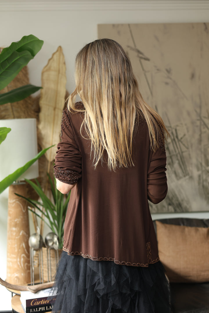 Delicada blusa para fiesta o matrimonio. Detales en mostacilla y bordados en cuello y mangas .