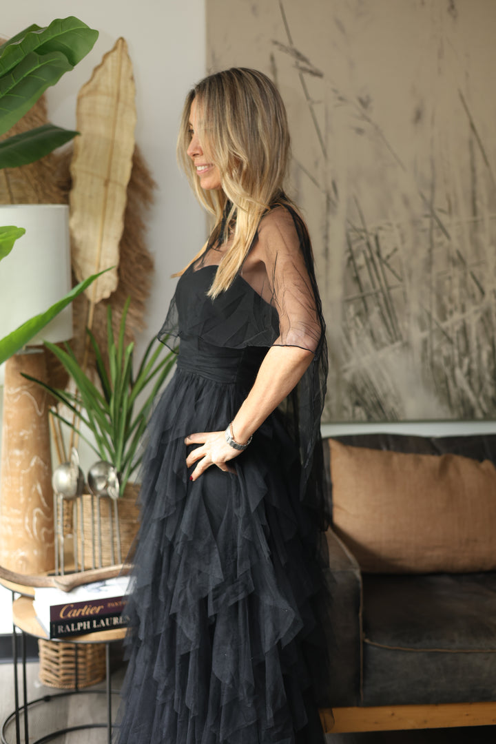 Sin lugar a dudas no existe nada más a la moda que ésta Capita semi transparente. Se pone como un collar chocker y de ese collar nace la Capita que queda abierta hacia atrás . Color negro . Sirve a un as y un L . Detalles en mostacillas .