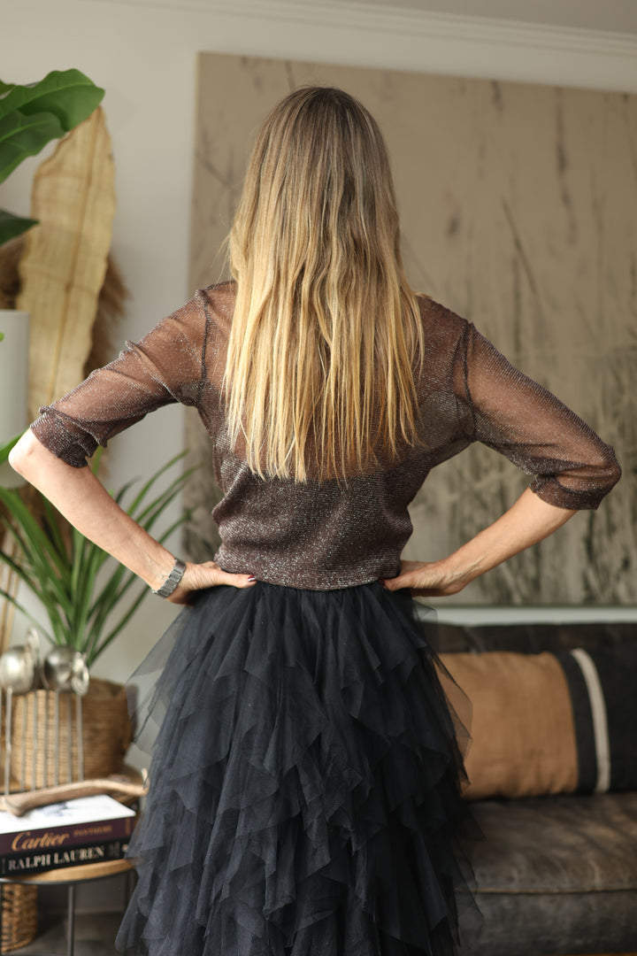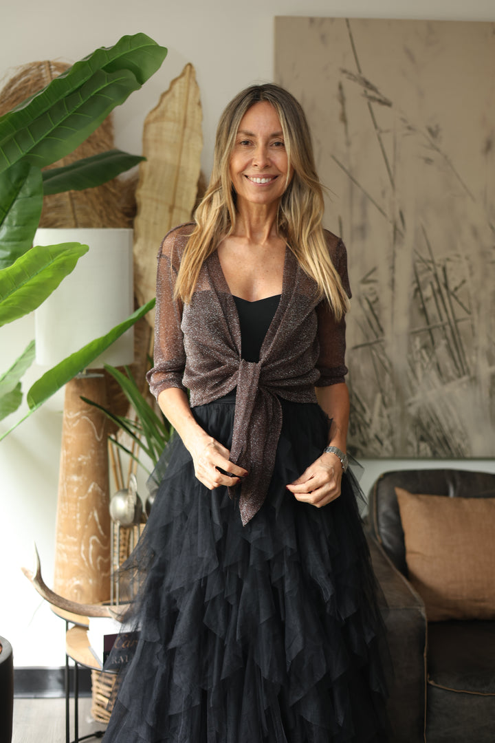 Delicado y liviano chaleco para uso amarrado . Color chocolate y plateado . Manga 3/4 . Sirve para un S un M y un ML .