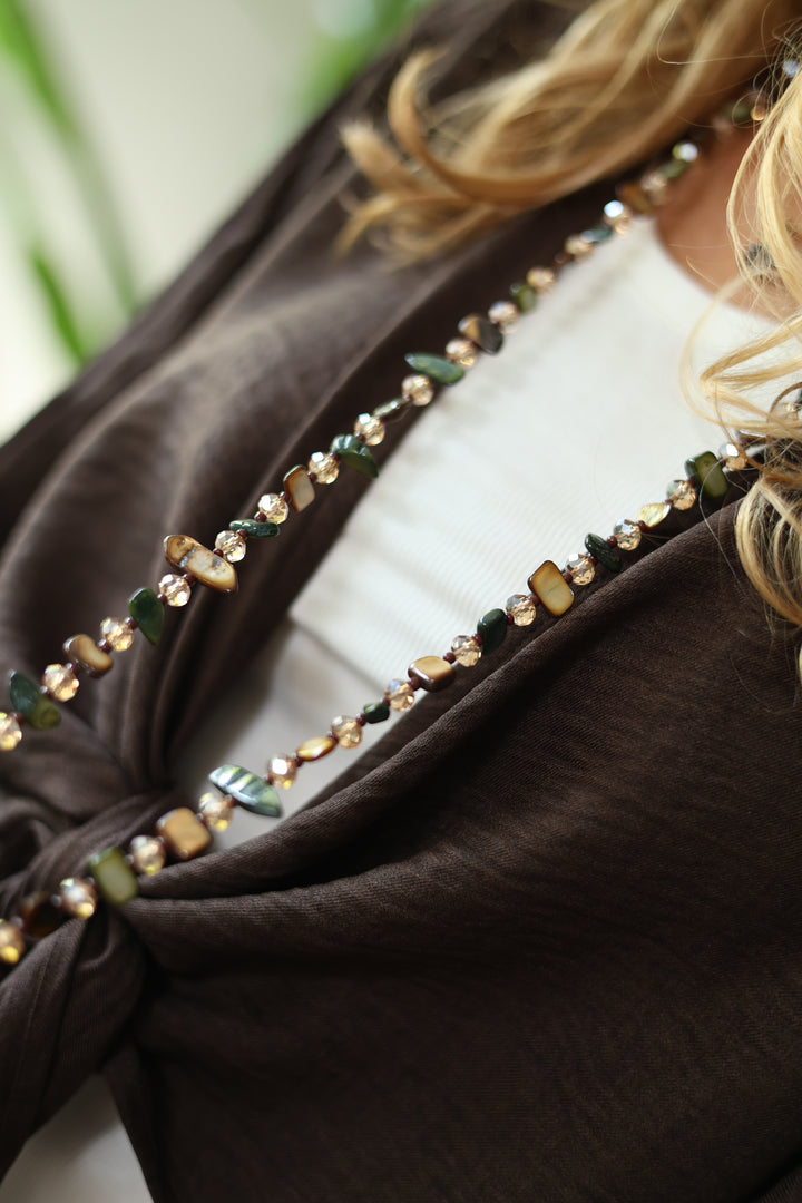El collar para lucir éste verano . Con los colores más de moda . Verde oliva y chocolate . Piedras irregulares. Cristales de fantasía.