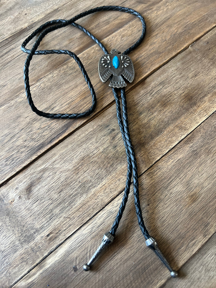 Totalmente moda western y muy amigable a la moda bohemia . Lo puedes usar solo al cuello o sobre una blusa . Ajustable x cuero ecológico . Excelente calidad . Plata envejecida. Águila con incrustación piedra turquesa.