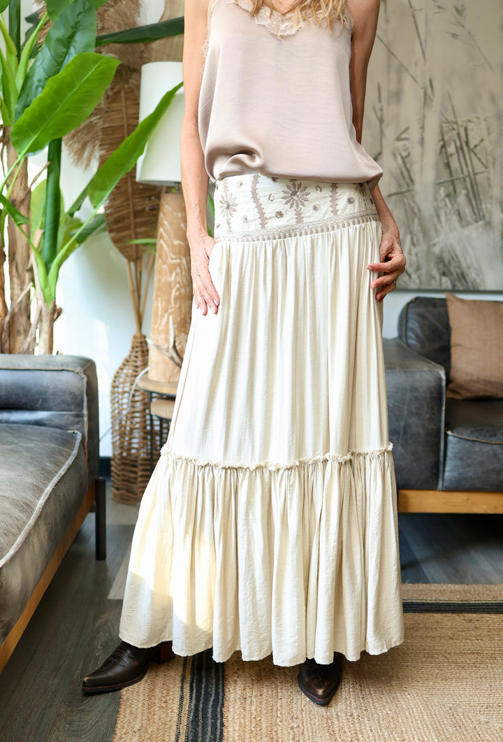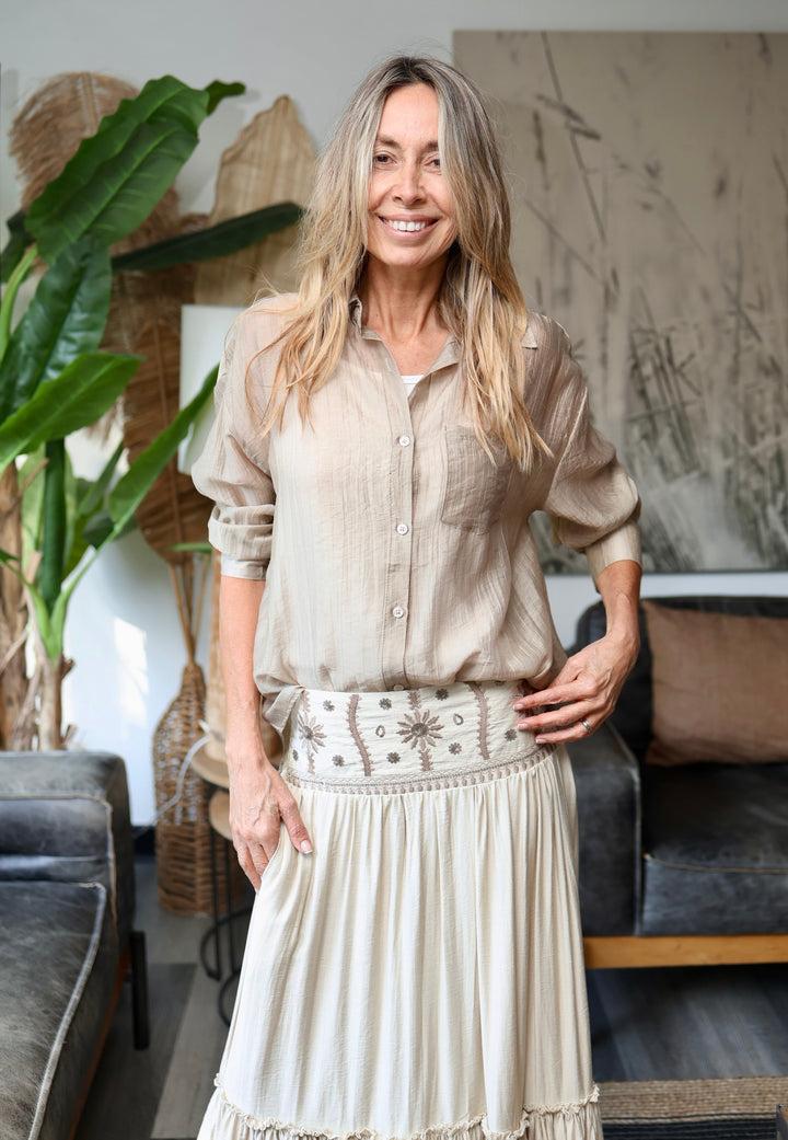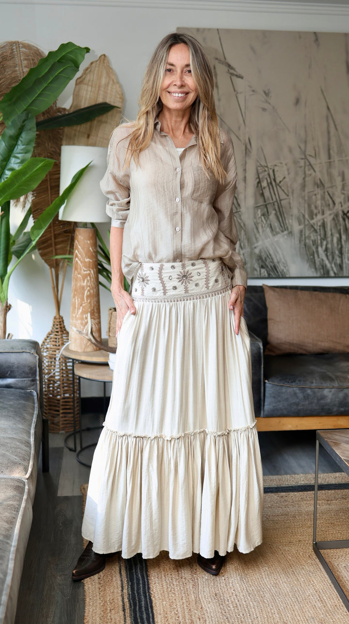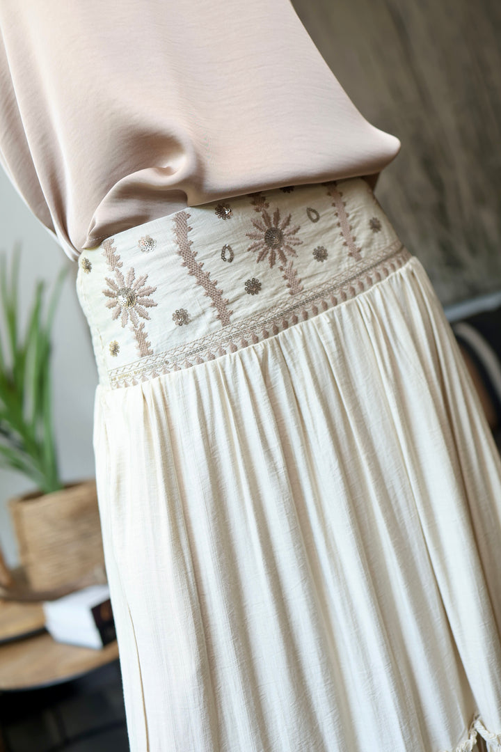 Muy Boho chic ésta maravillosa pollera con un dejo medio a satinado . Pretina bordada y con lentejuelas. Parte trasera elasticada .