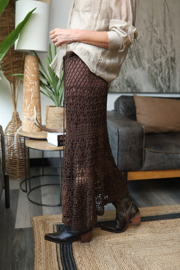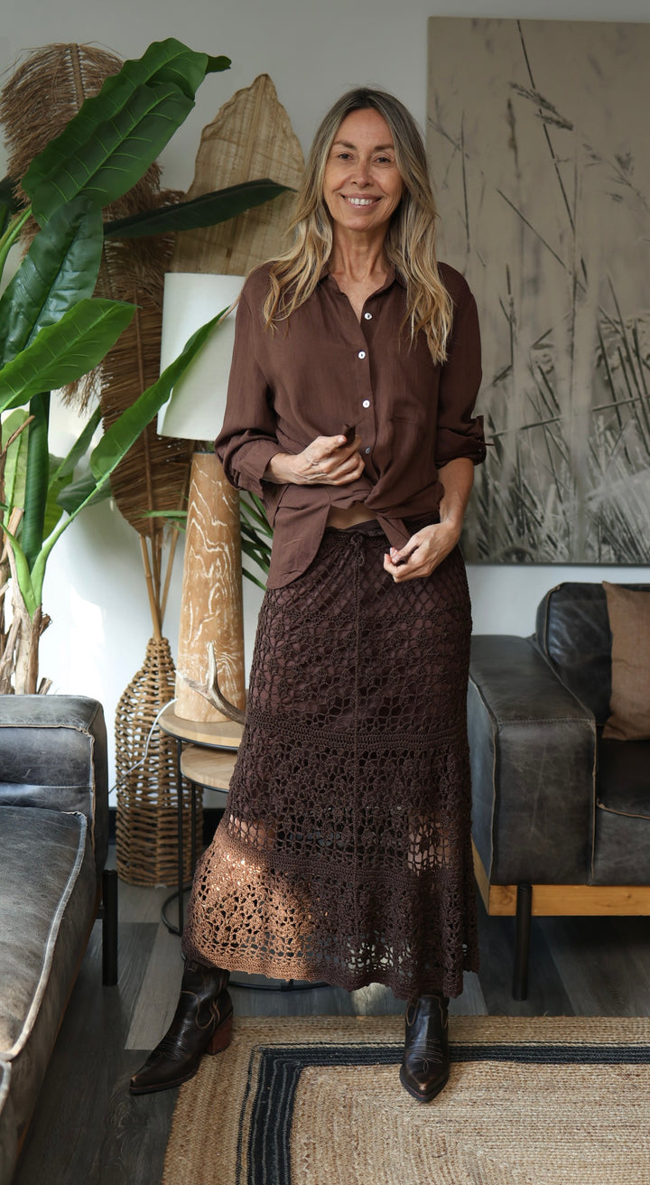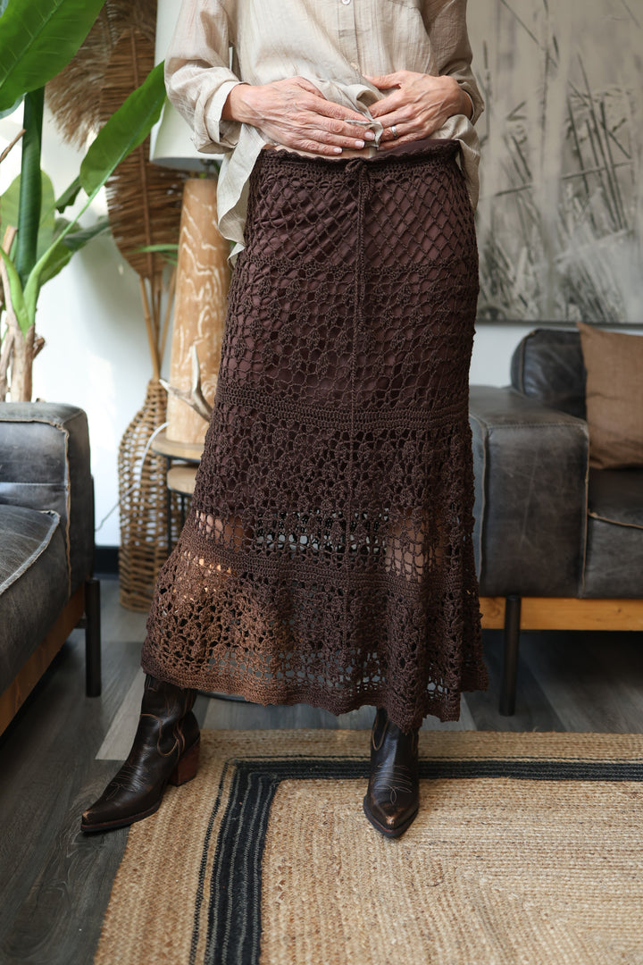 Pollera crochet color moka oscuro . Para una talla 36-38 . Correspondiente a un SM . Forro satin .