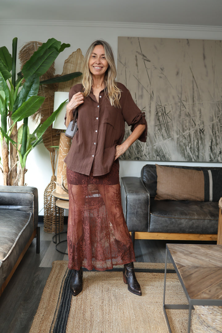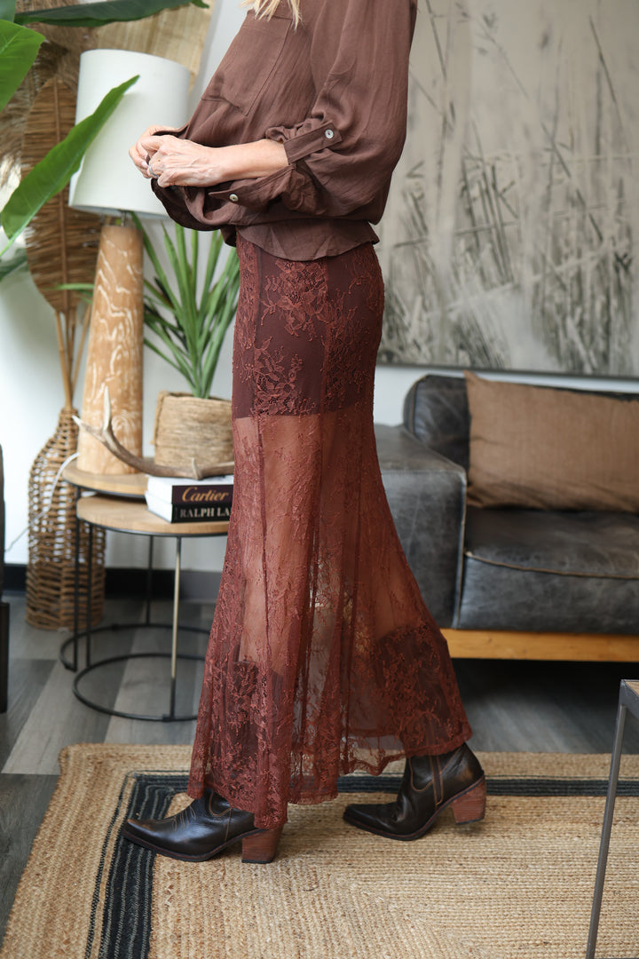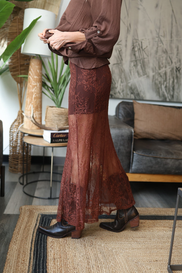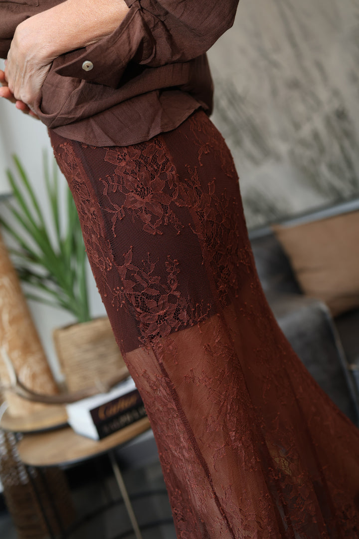 Indiscutible la más osada y ondear falda en encaje color maravilloso. Forro elasticado mini falda , en color chocolate. Encaje color marrón .