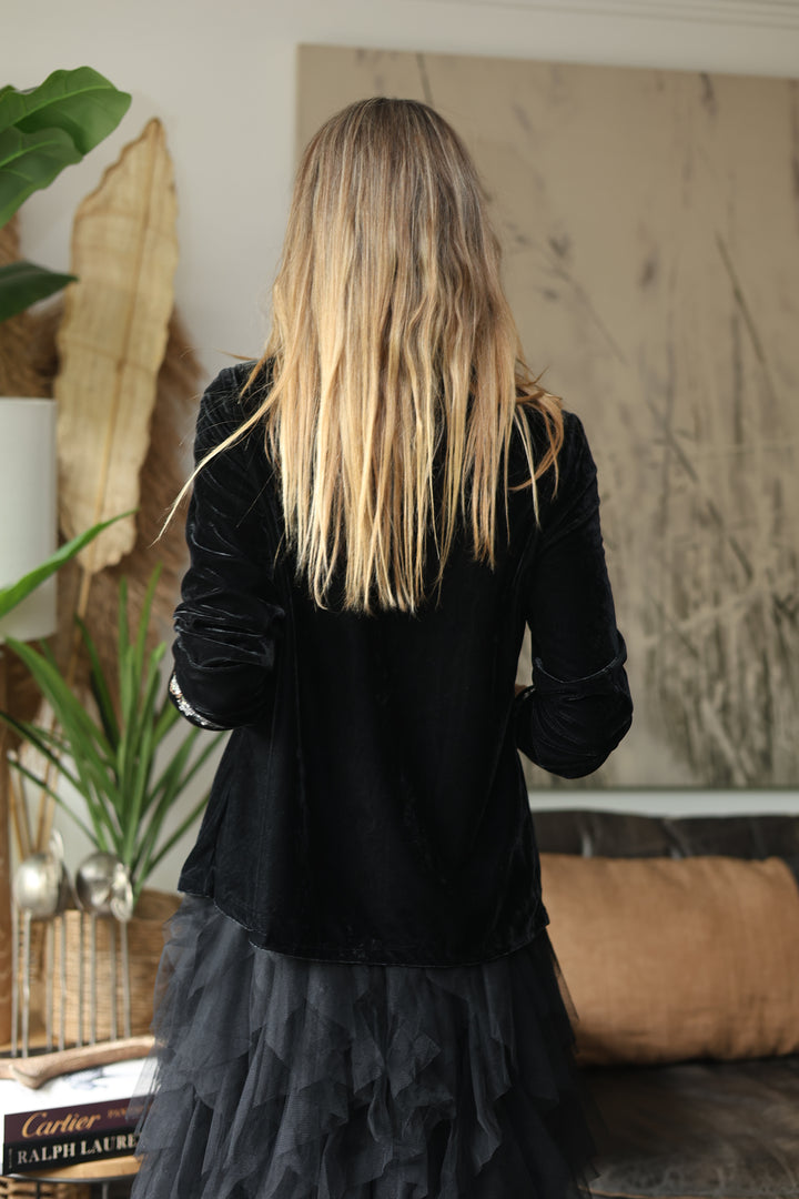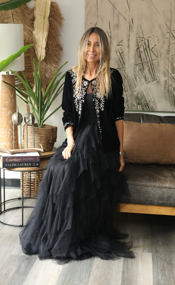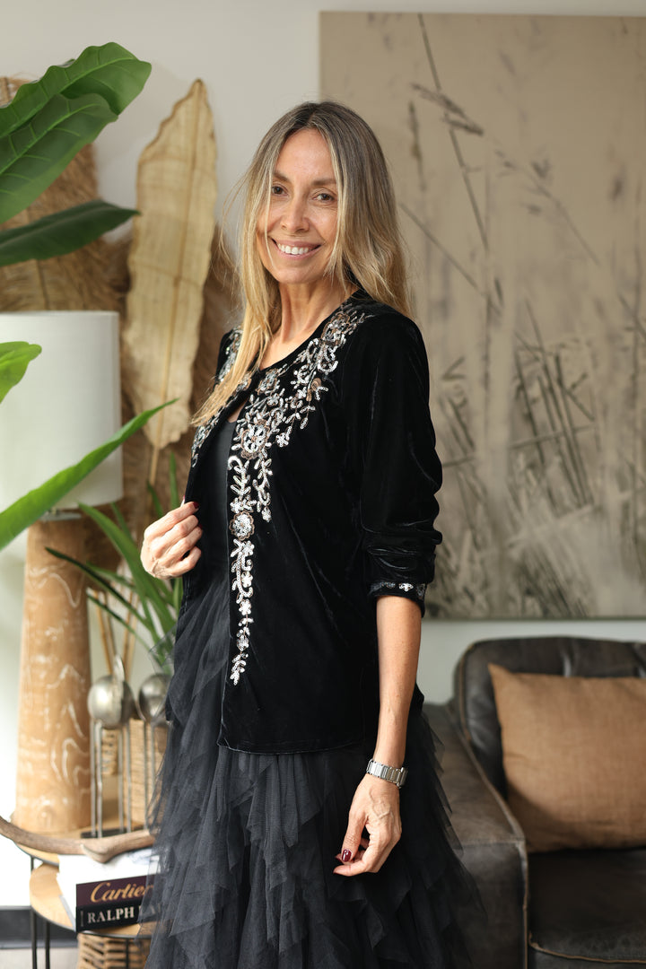 Tapado muy ideal para éste invierno. Tela similar al terciopelo. Con bordados y lentejuelas en bronce chocolate y plata . Oversize ML . Sin forro .